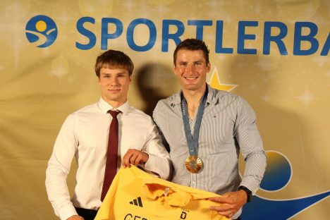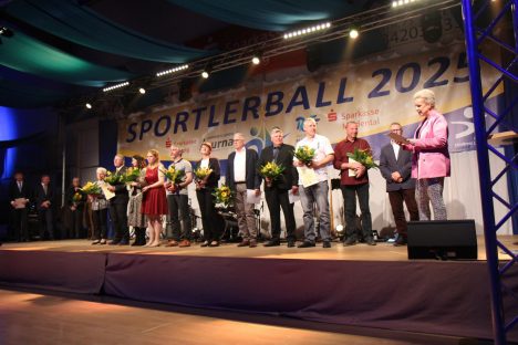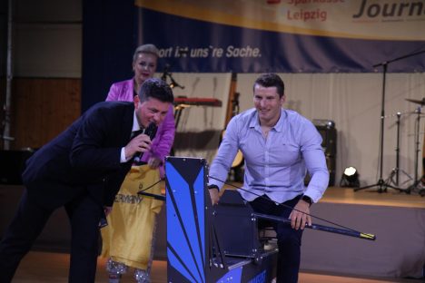 Nachdem sich alle Gäste ausgiebig am Festbuffet verköstigt hatten, zogen die Groitzscher Spielleute Mutzschen die allgemeine Aufmerksamkeit wieder in Richtung Bühne. Es folgten die Auszeichnungen der besten Sportlerinnen des Jahres 2024. Bevor die Herren an der Reihe waren, bat Diana Schell den frisch gebackenen „Sächsischen Sportler des Jahres 2024“ – Kanu Olympiasieger Tom Liebscher Lucz – zum emotionalen Plausch auf die Bühne. Am Ende setzte sich der Spitzensportler nochmal aufs Kajak-Ergometer und legte eine Zeit auf 100m vor, an welcher sich im Laufe des Abends die Gäste messen und ein original Shirt des Deutschen Olympiateams gewinnen konnten.