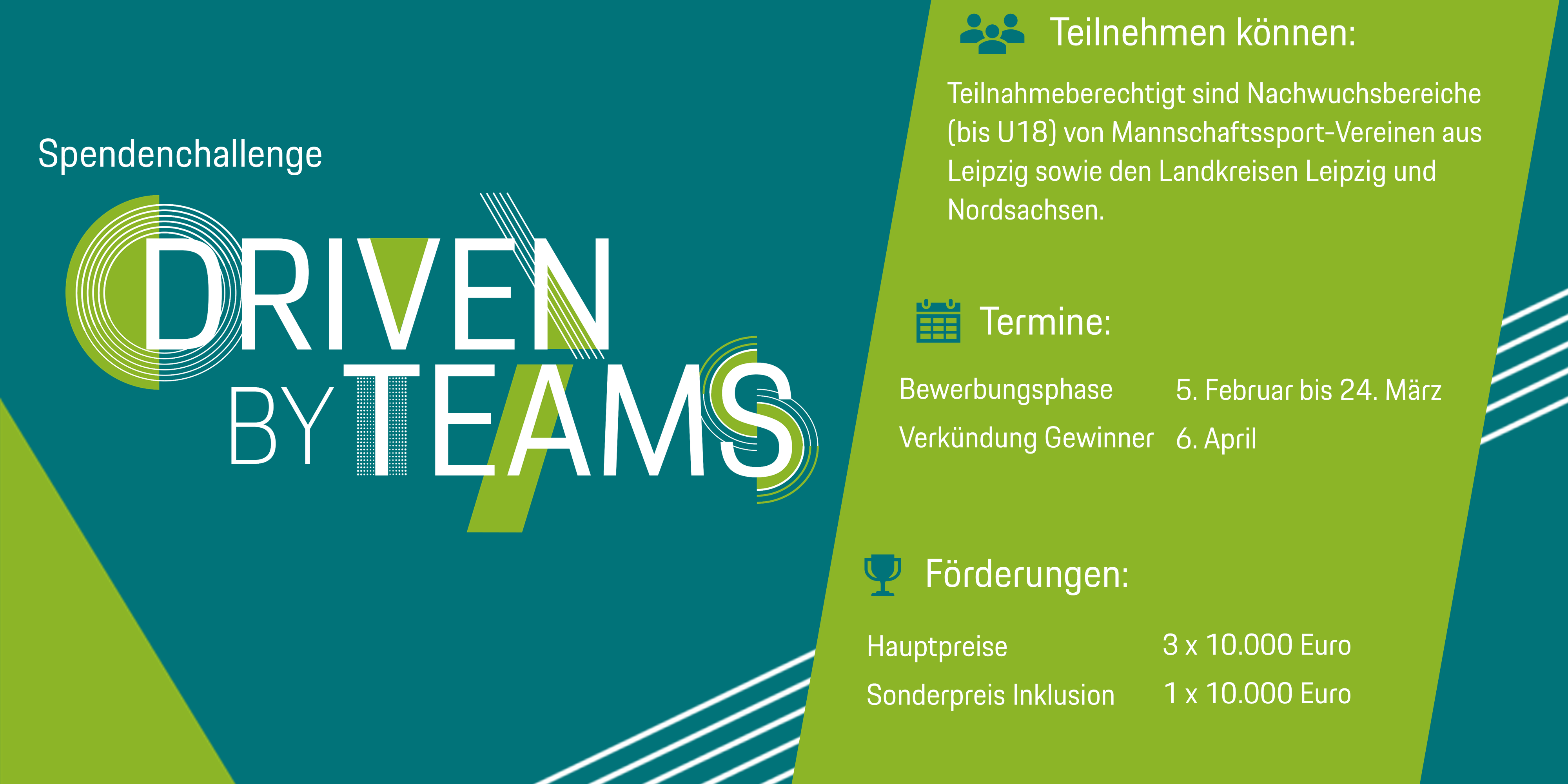 Unter dem Motto „Driven by Teams“ sucht Porsche Leipzig Sportvereine, die sich durch ihren innovativen, inklusiven oder integrativen Ansatz im Mannschaftssport und in der Nachwuchsförderung auszeichnen. Bis zum 24. März 2025 kann sich Euer Verein aus Leipzig sowie den angrenzenden Landkreisen Leipzig und Nordsachsen um eine Förderung bewerben. Macht mit und zeigt uns, wie Ihr Werte wie Toleranz, Respekt und Teamgeist im Vereinsalltag lebt. Überzeugt die Jury mit Eurem „Herzensprojekt“ für den Vereinsnachwuchs.